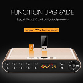 Характеристики: - Беспроводная конструкция Bluetooth для подключения к любым интеллектуальным устройствам с поддержкой Bluetooth - Светодиодный экран дисплея позволяет узнать рабочий статус динамика - 2200mAh литий-ионный аккумулятор обеспечивает более длительное время воспроизведения - Очень прост в настройке и использовании, ваш Bluetooth готов, ваша музыка готова - Воспроизведение музыки непосредственно с TF-карты, USB и 3,5 мм аудио устройств дает вам удобный опыт воспроизведения - Встроенный микрофон позволяет отвечать на звонки в режиме громкой связи - Поддержка FM функции автосканировать